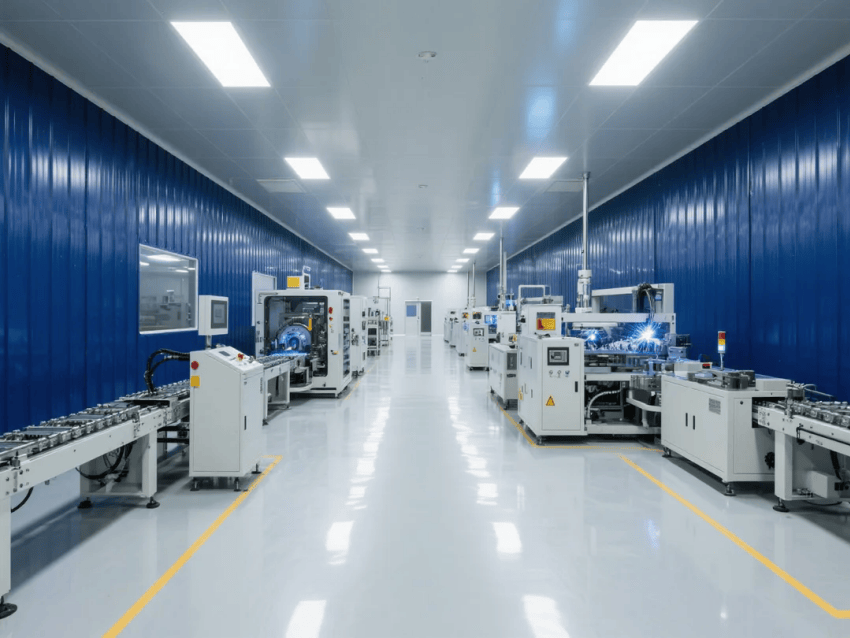 車間采用模塊化潔凈室結(jié)構(gòu),墻體采用50mm厚深藍(lán)抗菌彩鋼板,接縫處采用圓弧處理工藝。自動(dòng)化沖壓線與激光焊接工作站呈U型交替布局,工作站間設(shè)置深灰不銹鋼傳遞窗,確保物料流轉(zhuǎn)潔凈度。吊頂系統(tǒng)配置FFU高效過濾單元,維持≥20次/h換氣次數(shù),氣流組織采用頂送側(cè)回模式。