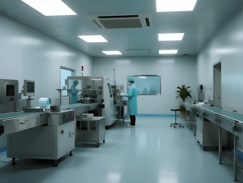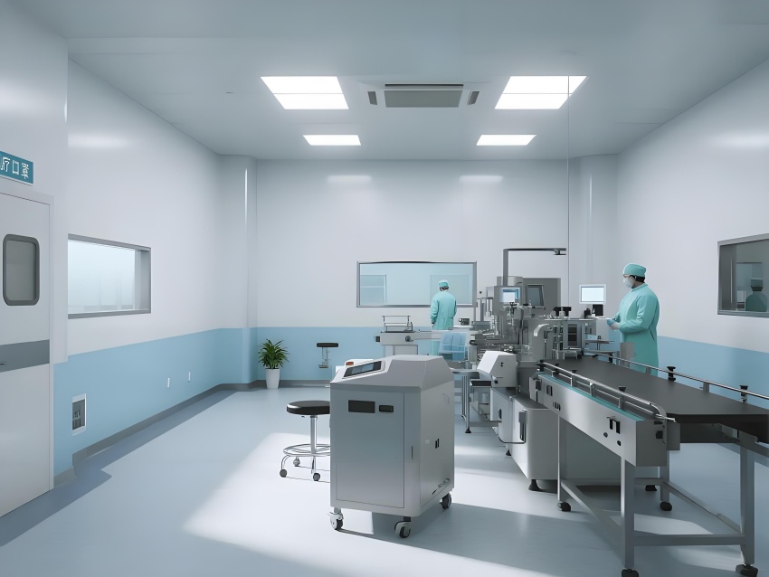 本潔凈車間設(shè)計采用現(xiàn)代工業(yè)極簡風格,強調(diào)功能性與潔凈度。主色調(diào)選用淺灰藍(墻面)與純白(頂面)的搭配,營造冷靜專業(yè)的氛圍,局部用淡綠色做視覺緩沖。