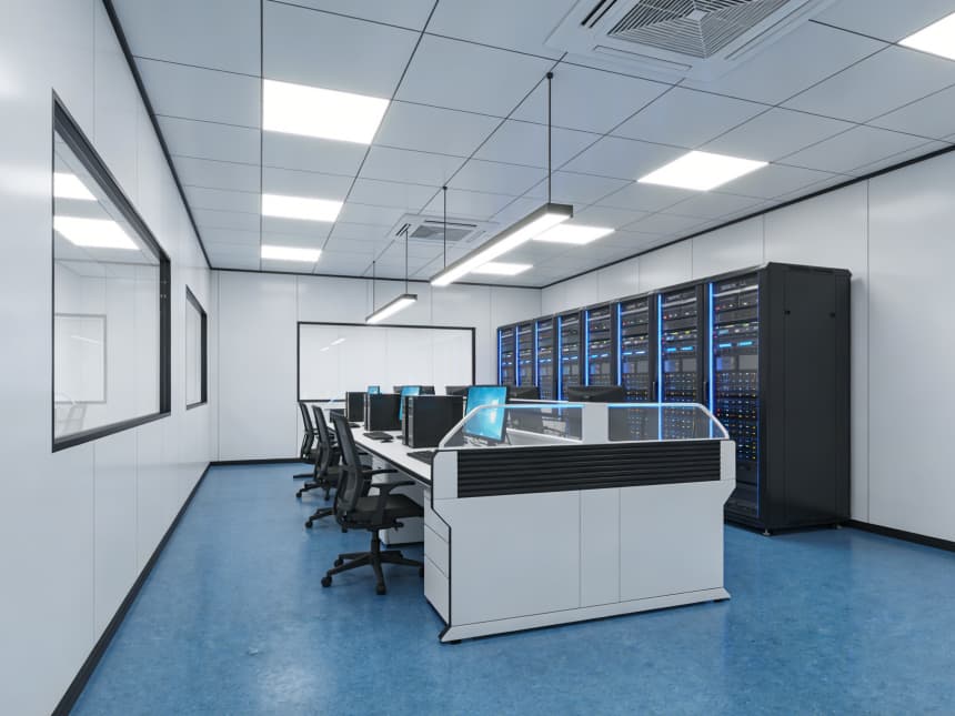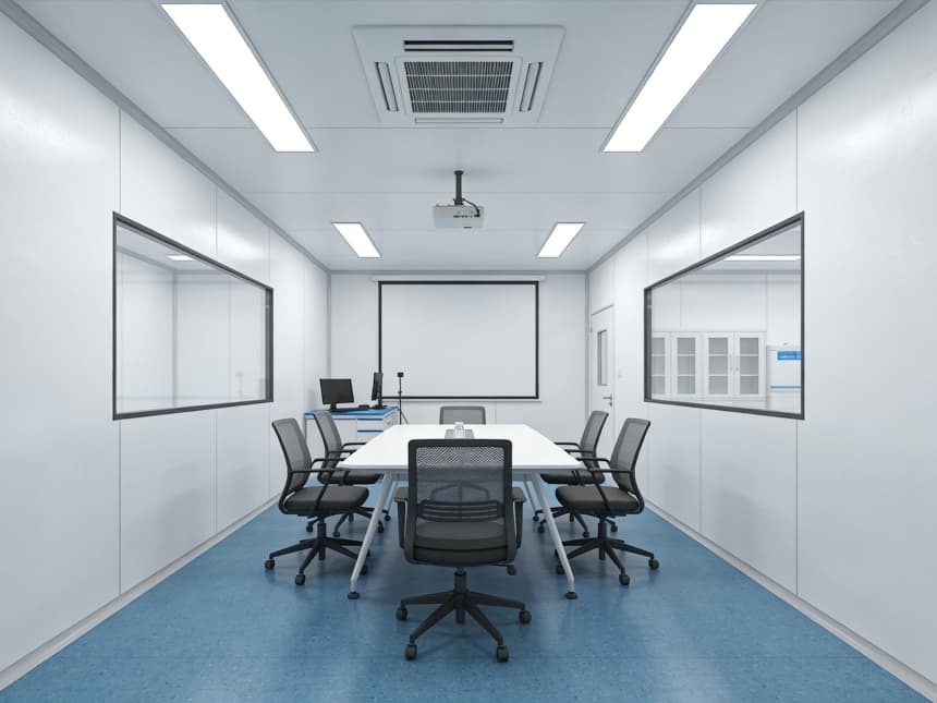 內部研發空間均以藍色耐磨防靜電地坪搭配白色無縫抗菌墻面,視覺清爽且適配研發需求。藍色地面選用高耐磨環氧材質,具備良好的承重性與易清潔性,可耐受實驗試劑殘留擦拭,同時兼具輕微防靜電性能,保護精密研發設備;白色墻面采用環保抗菌涂層,平整度高且減少光線反射,搭配嵌入式護眼照明,營造舒適的研發視覺環境。