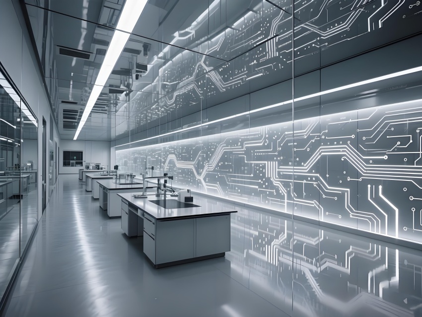 本實驗室采用"量子科技美學"設計,將納米尺度的精密感轉化為空間敘事。主實驗區以鏡面銀與深空灰為基調,半透明防輻射玻璃墻體內嵌電路板紋理光帶,象征微觀世界的電子軌跡。百級潔凈區的金色氣流箭頭與千級區的藍色光暈形成能級躍遷般的視覺分級,CVD設備艙的蜂窩狀散熱孔與懸浮式控制面板構成未來工廠意象。地面導光纖維模擬分子結構網絡,天花板動態粒子監測屏以數據流形式投射納米顆粒分布。通過冷調LED與設備熒光的層次照明,在滿足EMI屏蔽與化學防護需求的同時,創造出如同操作量子領域的沉浸式科研環境,透明氣閘門上的全息警示標志進一步強化尖端材料研究的科技儀式感。