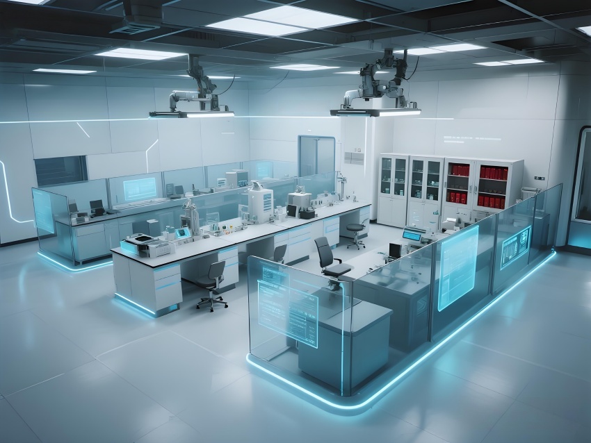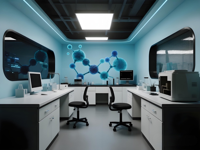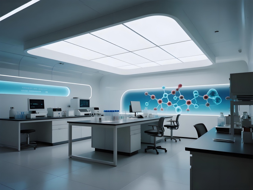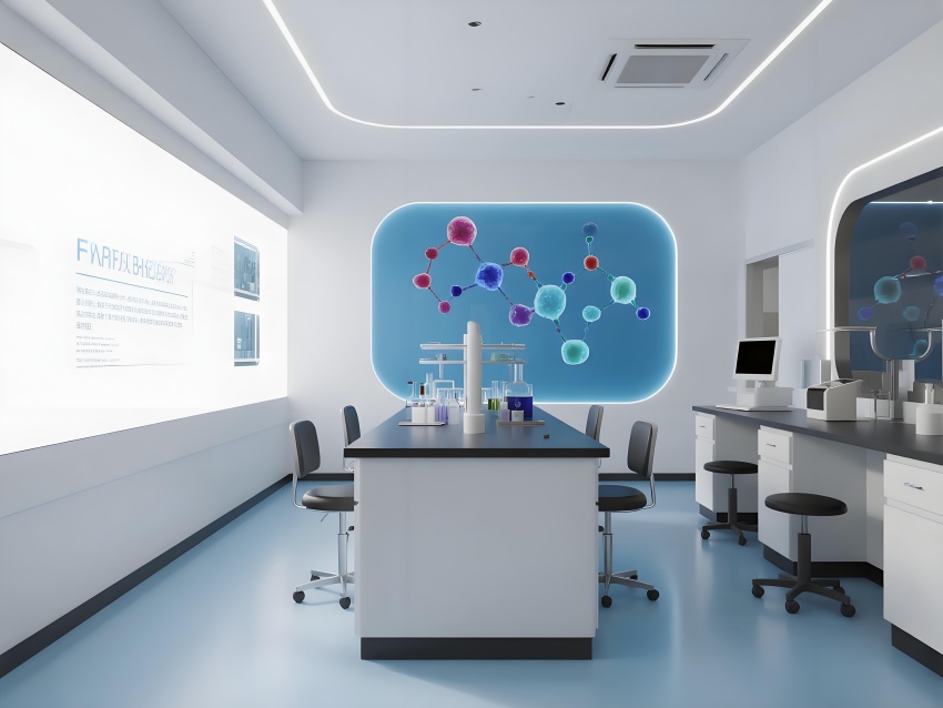 本設計以"科技賦能生命"為核心理念,構建純凈高效的研發環境。主體采用冰川白與醫用藍的漸變配色,墻面嵌入動態生物分子結構LED裝飾,營造科研儀式感。實驗區采用模塊化懸浮工作臺,透明智能玻璃隔斷實現空間通透性與功能分區的完美平衡。頂棚的流線型送風系統與地面熒光導視帶形成立體動線指引。核心無菌區采用圓形穹頂設計,搭配全息投影滅菌提示界面。數據分析中心配備曲面智能白板墻,實時可視化研究數據。?;反鎯^通過紅色光暈警示與物理隔離確保安全。整體空間融合醫療級潔凈美學與科幻實驗室語言,在嚴謹中注入未來感,通過智能交互界面與人性化燈光系統,打造國際一流水準的醫藥研發矩陣空間。