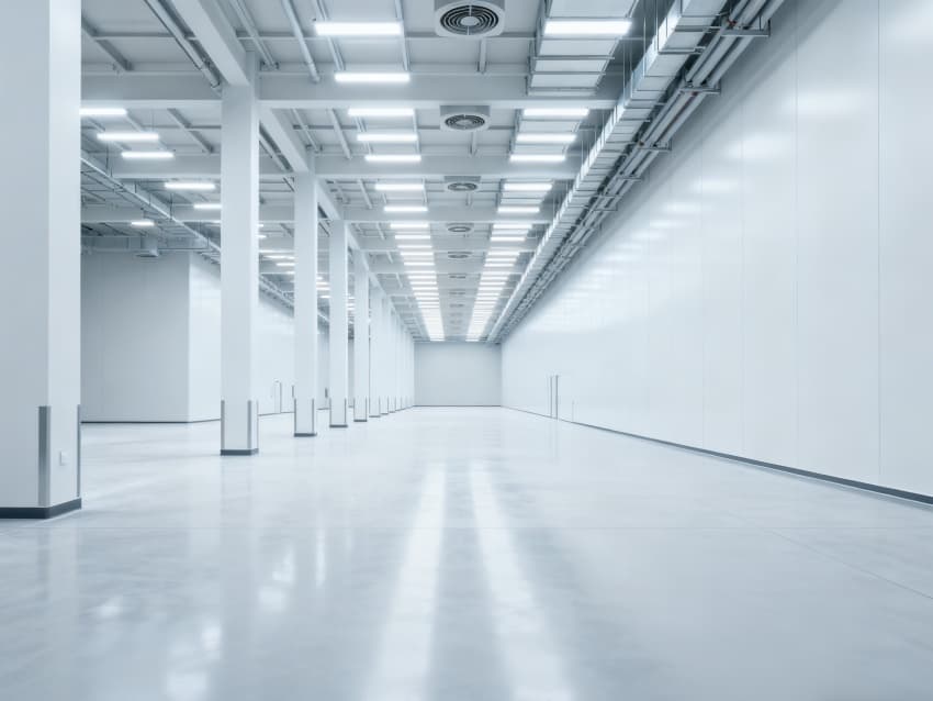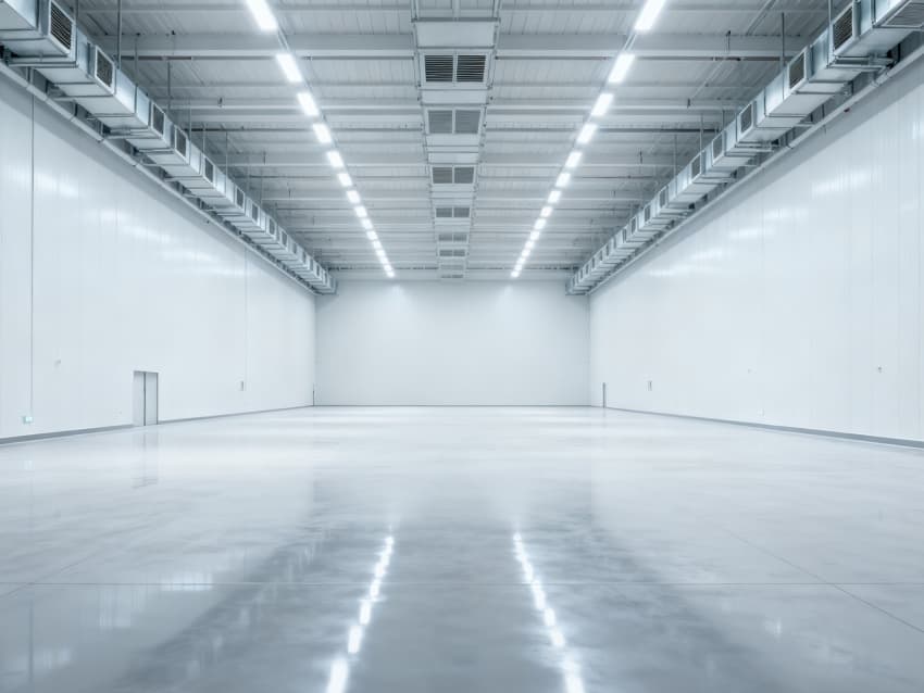 內(nèi)部6個生產(chǎn)車間均為無設(shè)備空曠布局,按工業(yè)級潔凈與承重標(biāo)準(zhǔn)建設(shè):地面鋪設(shè)耐磨防靜電環(huán)氧地坪,墻面采用白色環(huán)保潔凈墻板,陰陽角做圓弧處理減少積塵;柱網(wǎng)間距達(dá)10米,預(yù)留設(shè)備安裝與物流通道空間;頂部整合恒溫恒濕新風(fēng)系統(tǒng)與節(jié)能LED照明,管線暗藏于吊頂內(nèi),避免空間雜亂;車間之間通過通透玻璃隔斷銜接,進一步強化整體空曠感,為新能源產(chǎn)品規(guī)模化生產(chǎn)、柔性產(chǎn)線調(diào)整提供高效、潔凈的空間支撐。