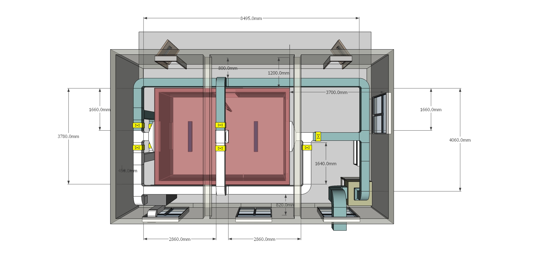 4)墻壁面預留開口,用于內(nèi)室測量儀器的排氣管道。側墻設置觀察窗。