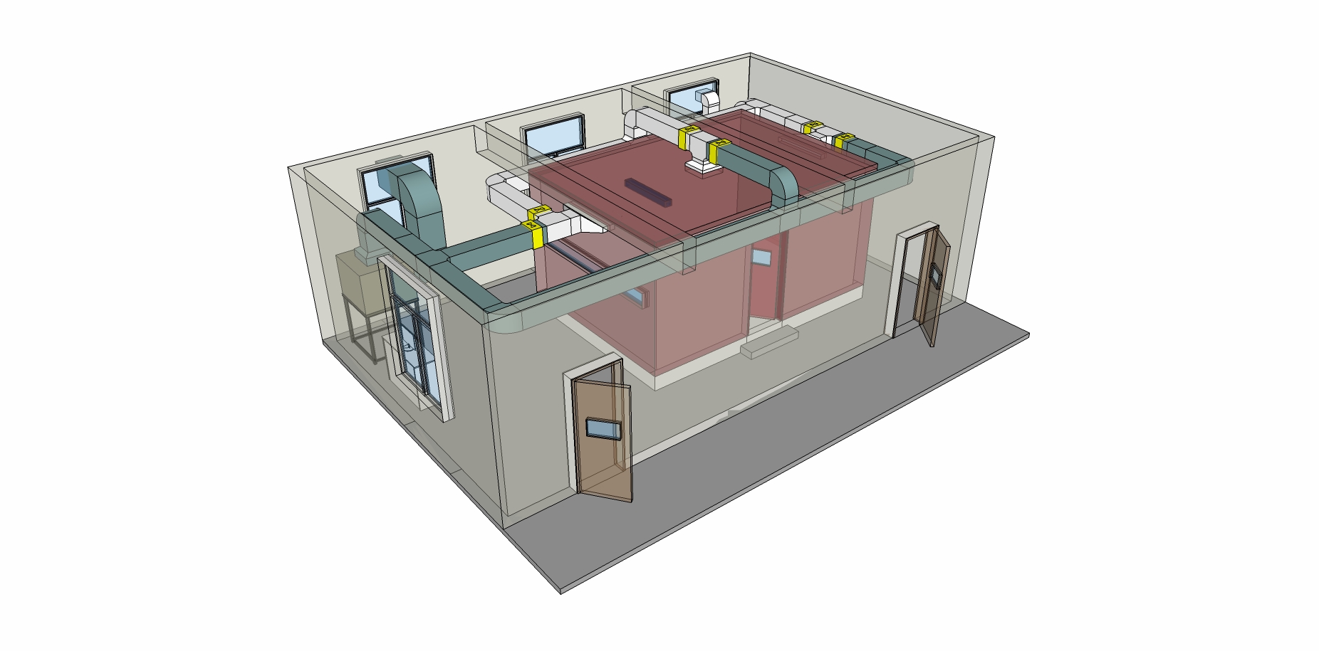 實驗內(nèi)室能夠?qū)崿F(xiàn)溫度、濕度獨立控制。整套系統(tǒng)共設置3個風口,可以自由轉換為送風口或回風口,采用球形電磁閥門控制方向轉換。風口在關閉時需保證有良好的密封性能。同時,設置個性化送回風裝置。各風口作用轉換,可以實現(xiàn)不同的氣流組織形式。換氣次數(shù)使用變頻進行改變。設有觀察窗兩個,分別位于實驗小室的頂棚中部和側面中部(有門一側)。