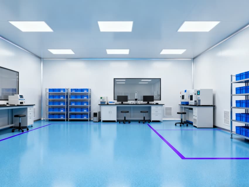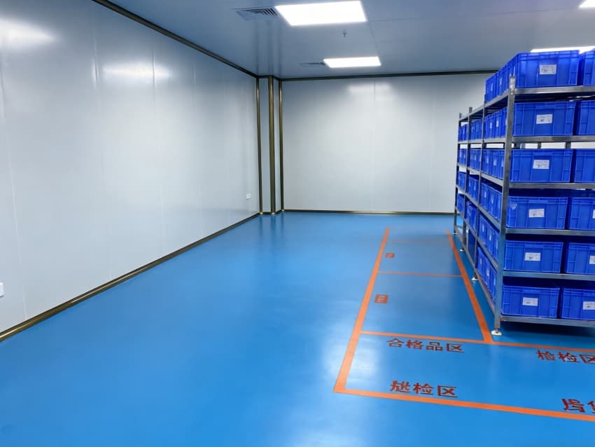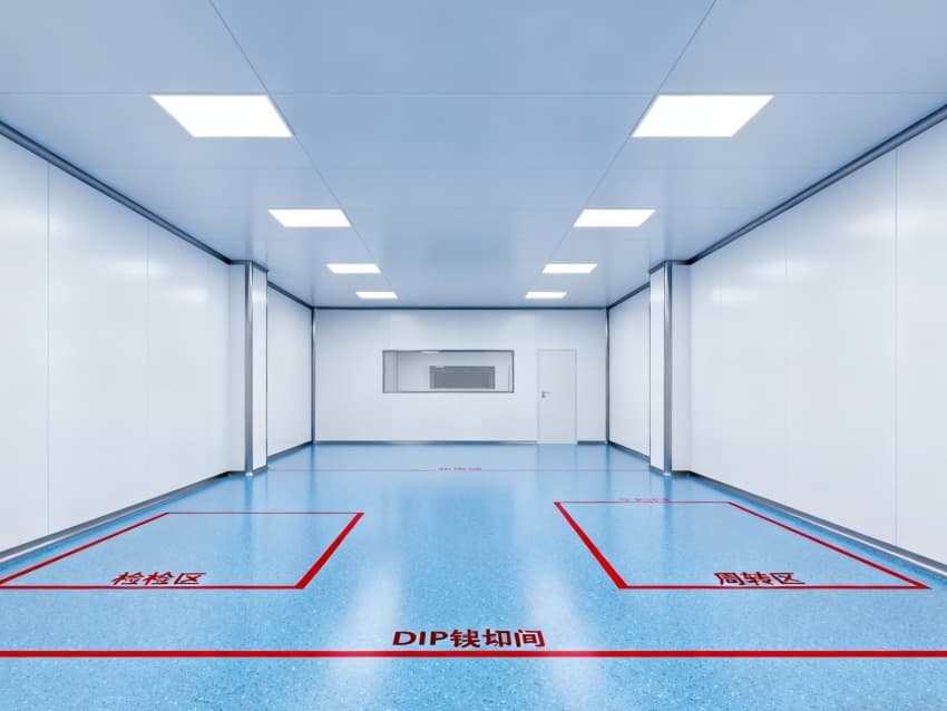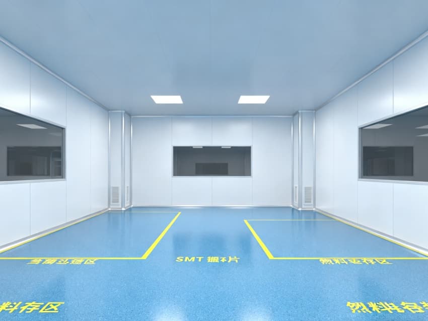 車間整體采用工業極簡主義設計風格,以藍白為主色調實現功能分區可視化:地面選用定制化藍色防靜電環氧地坪,經三層復合工藝處理,表面電阻值穩定維持在10?-10?Ω標準區間,不僅能有效泄放靜電,更通過添加納米級耐磨顆粒提升抗壓強度,配合防滑紋理設計,確保日均萬步以上的高頻作業場景下仍能保持表面完整性;四周白色防塵墻壁采用啞光抗菌涂層,配合弧形墻角設計消除積塵死角,在減少光線反射干擾的同時,可抑制99.9%的常見微生物滋生。頂部集成FFU(風機過濾單元)陣列與智能氣流監測系統,通過12級梯度風壓調控,實現每小時600次換氣頻率,持續維持ISO5級(千級)潔凈度標準,確保直徑≥0.5μm的懸浮粒子濃度控制在35200個/m³以內,全方位隔絕粉塵、纖維、微生物等污染源對精密元器件的潛在威脅。
